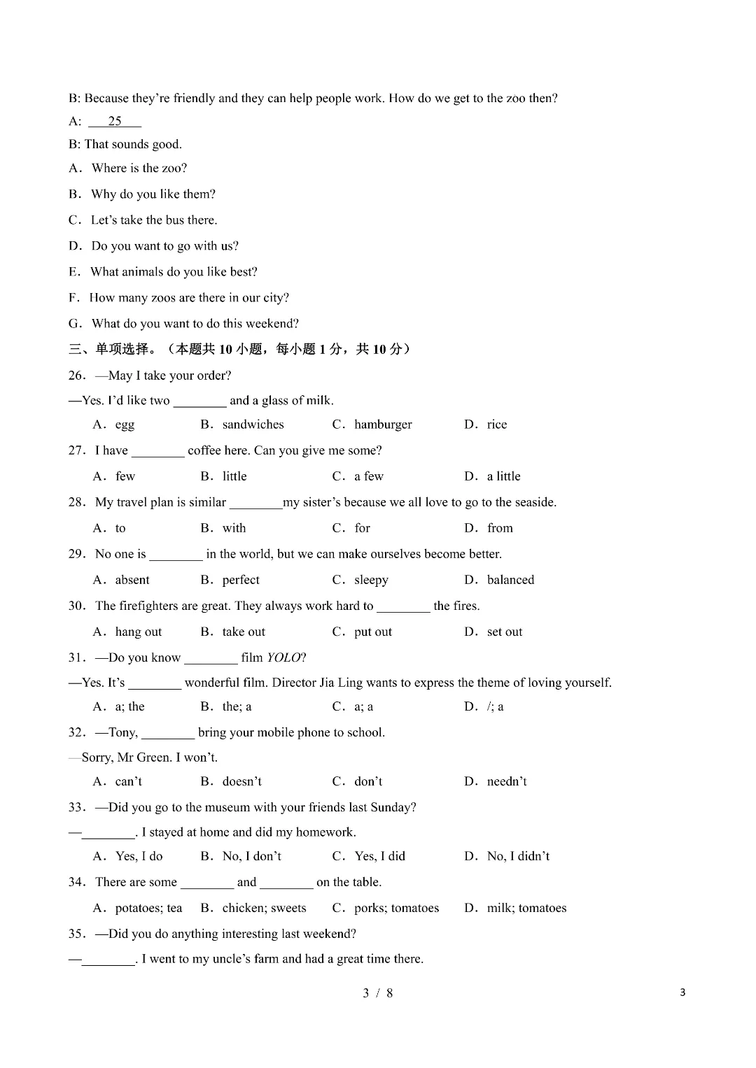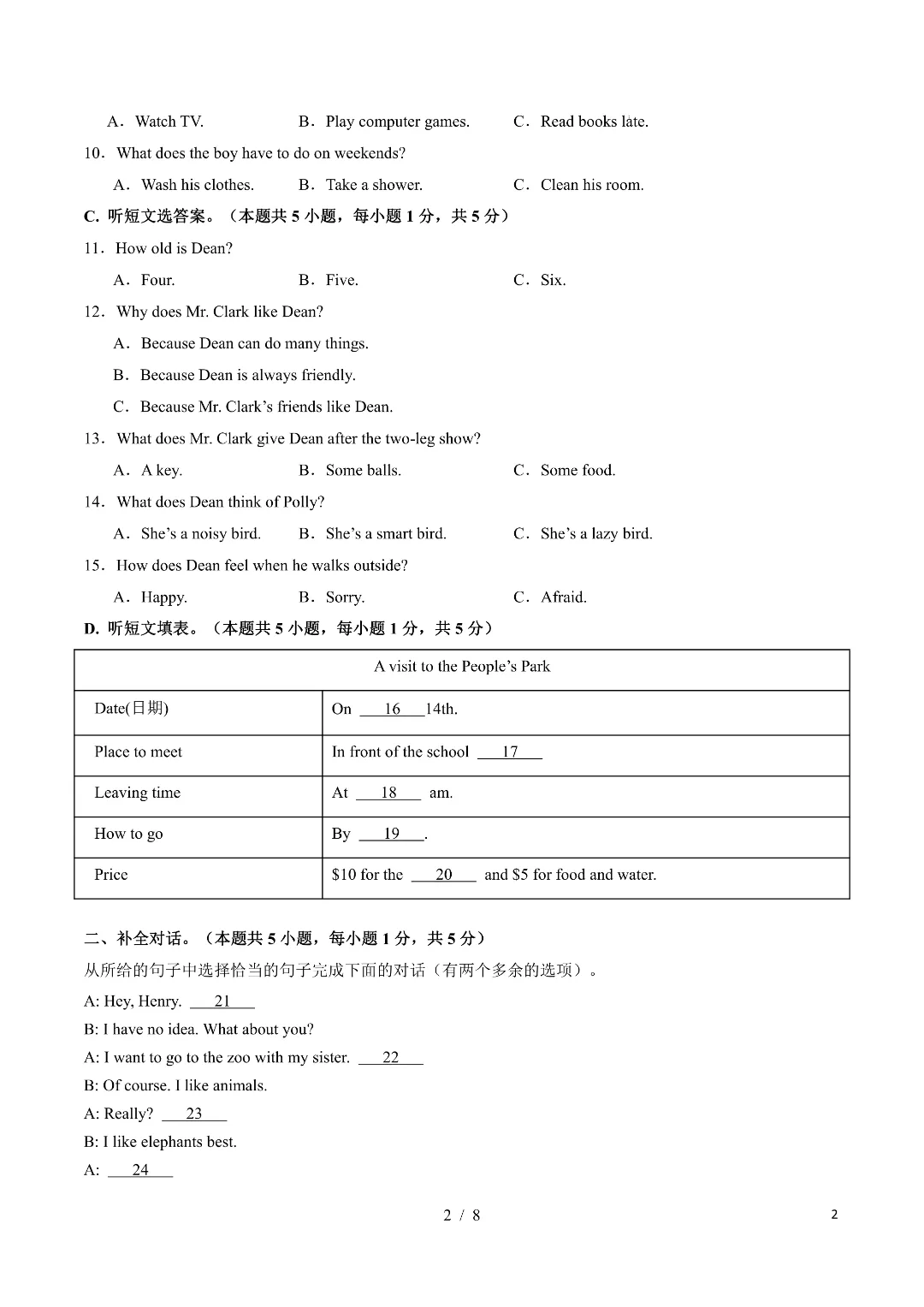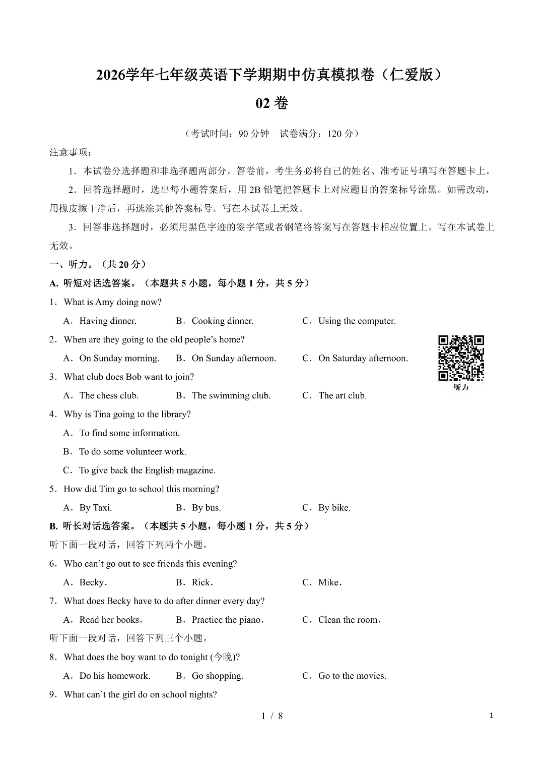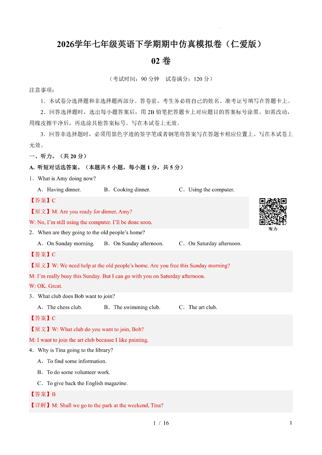 今日给家长朋友们分享的是:2026年新七年级下册初一仁爱版英语《期中模拟测试卷》含答案解析‖电子版可打印