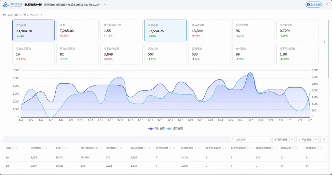 一键分析销售核心数据,包括支付金额、花费、推广直接投产比、退款金额、商品访客数、支付买家数、支付转化率、老支付买家数、新支付买家数、老客支付金额、加购人数、加购件数、支付件数、访客平均价值等,同时生成清晰趋势变化图,高效掌握商品销售波动、转化情况一目了然。