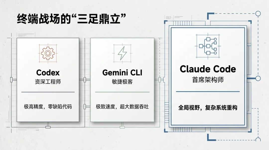 目前市场上三足鼎立:OpenAI 的 Codex (GPT 5.2)、Anthropic 的 Claude Code 以及 Google 的 Gemini CLI。它们不再是简单的聊天机器人,而是能直接接管你整个工作流的”数字员工”。
