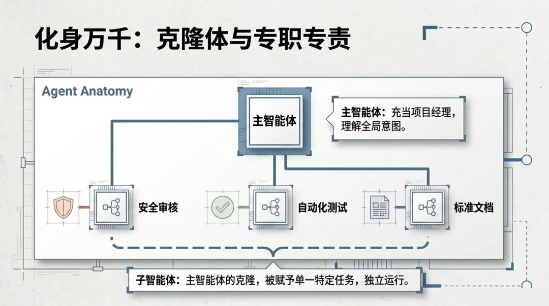 你可以克隆一个 Claude 实例,给它一个具体的身份(如:安全审计员、测试编写员、文档官)。