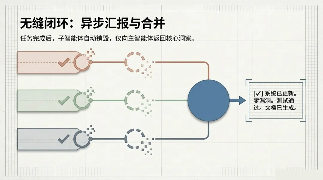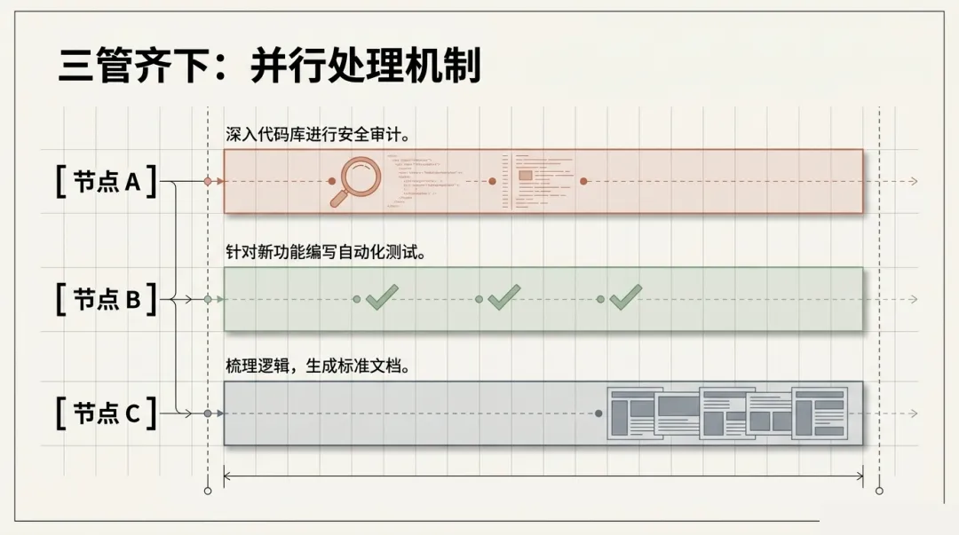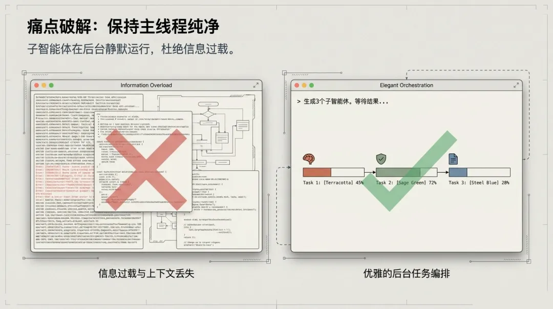 实操工作流:主 Agent 作为项目经理分发任务,子助手 A 审计代码,子助手 B 写文档,子助手 C 检查样式。这种并行自动化工作流能让一个人的开发效率抵得上一个小组。