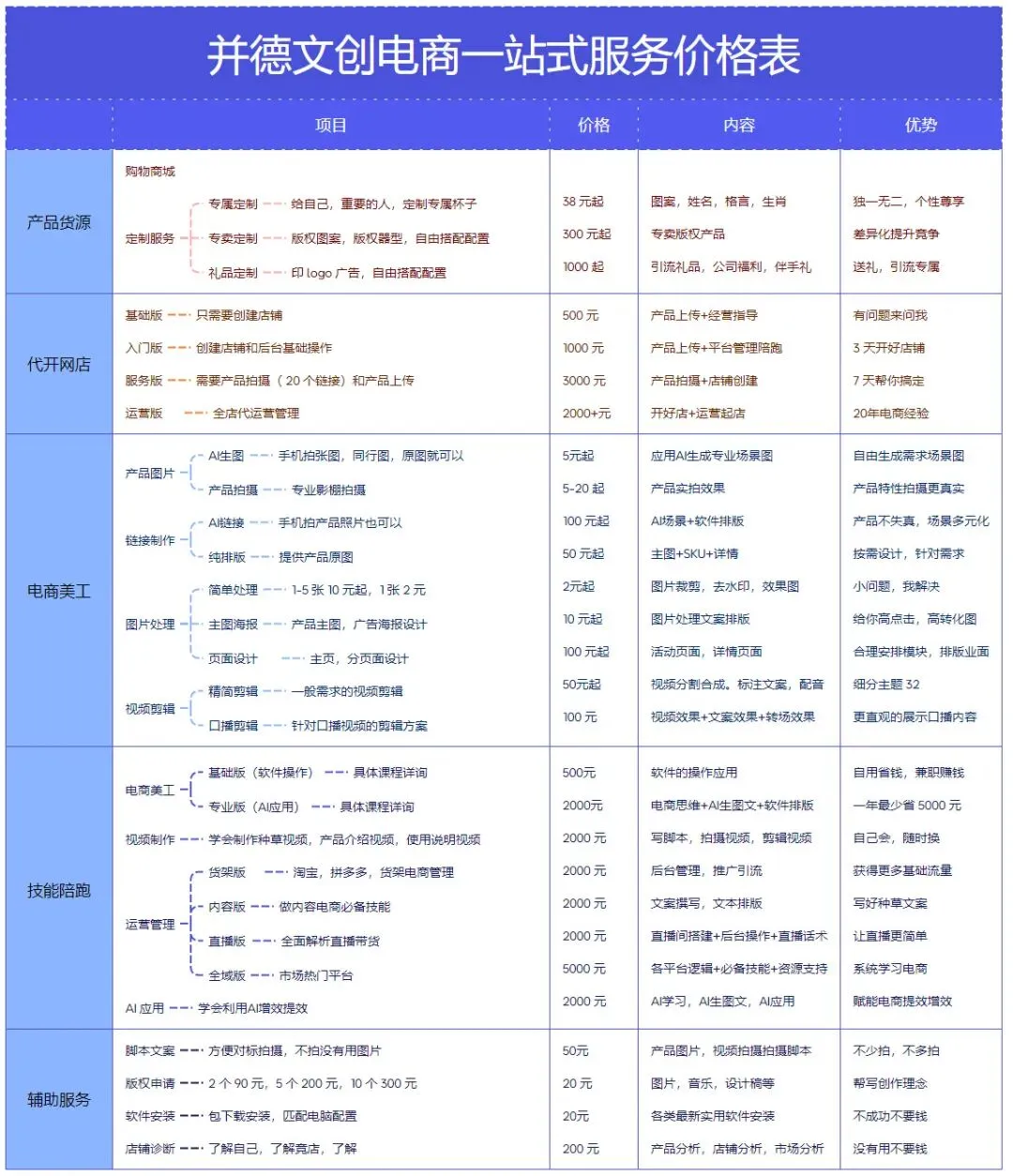 做文创电商,是不是总被“选品难、开店繁、美工贵、运营懵” 追着跑?别慌!今天把我们的「并德文创电商一站式服务价格表」 完整公开,从产品货源→代开网店→电商美工→技能陪跑→辅助服务,全链路解决你的痛点,定价透明+服务硬核,看完你就知道值不值👇