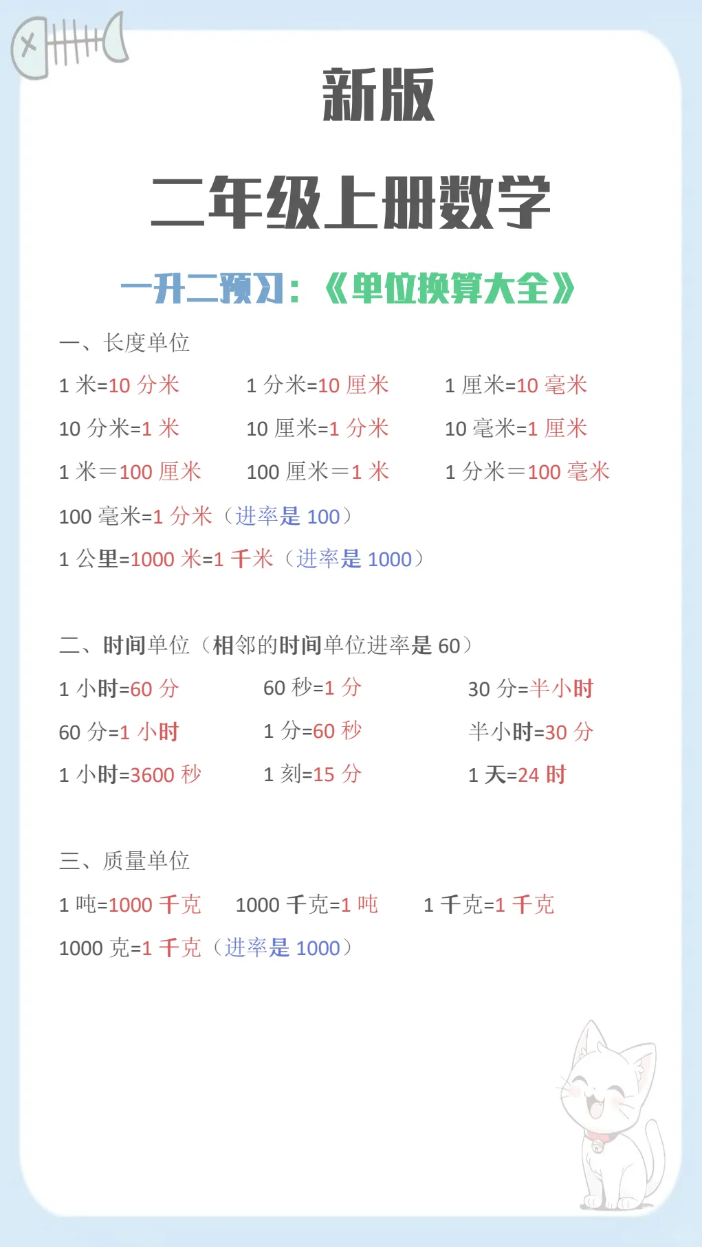 【新版】二年级上册数学单位换算大全,共1页,电子版可下载可打印,这份资料围绕二年级上册数学中的单位换算专项进行整理,帮助孩子熟悉常见单位之间的换算方法,进一步巩固相关基础知识与应用思路,内容清晰、使用方便,适合日常练习与查漏补缺,需要的家长可以及时下载打印出来,让孩子练一练。