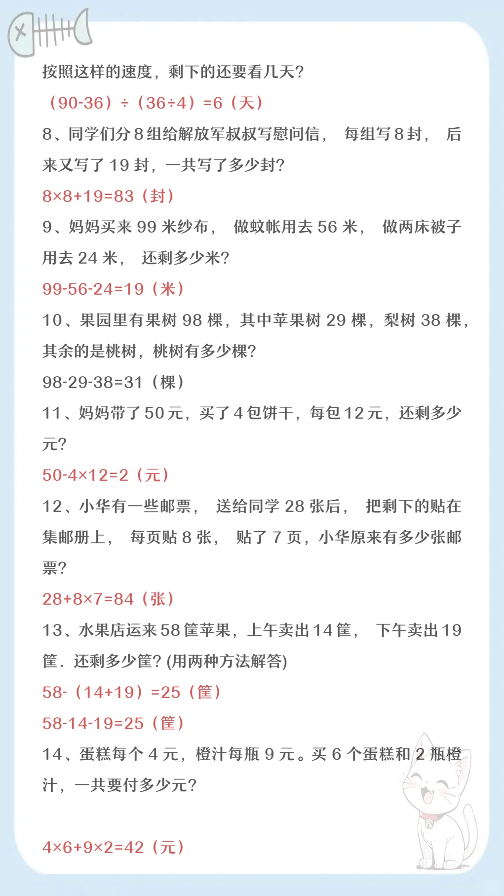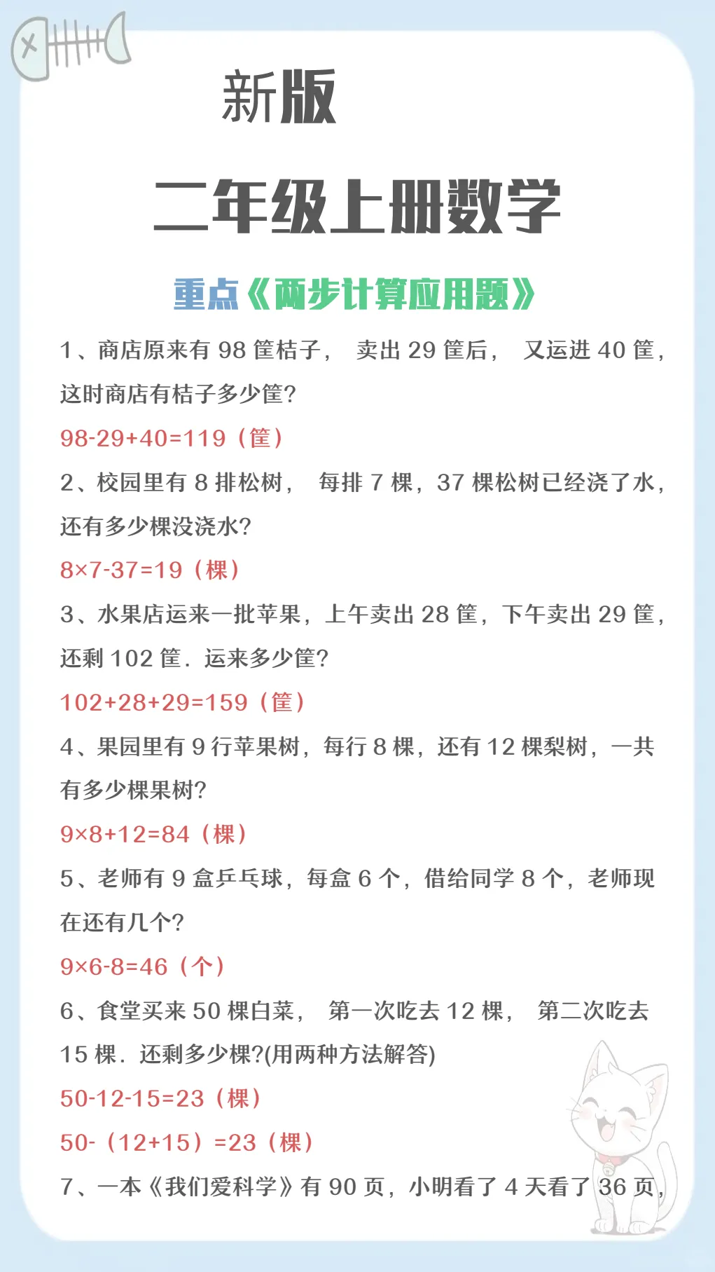【新版】二年级上册数学两步计算应用题,共3页,电子版可下载可打印,这份专项练习围绕二年级上册数学两步计算应用题训练设计,帮助孩子进一步理解题意、梳理解题步骤,提升分析数量关系和连续运算的能力,内容紧扣同步学习中的常见题型,适合日常巩固与阶段练习。需要的家长可以及时下载打印出来,让孩子练一练,更好地夯实应用题基础。