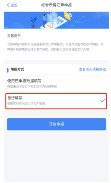 在进入申报界面后选择【自行填写】,确认基本信息。