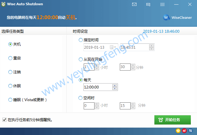 此次分享命令仅在Windows7环境下作为演示但Windows各个系统版本都是一样可以使用的,喜欢的偷懒图个简单的可以使用下面分享的实用小工具,Wise Auto Shutdown能够实现指定时间或倒计时的方式自动关机,除此之外我们还可以设置自动关机前5分钟提醒功能,避免使用电脑时精彩部分来了一半就关机黑屏了
