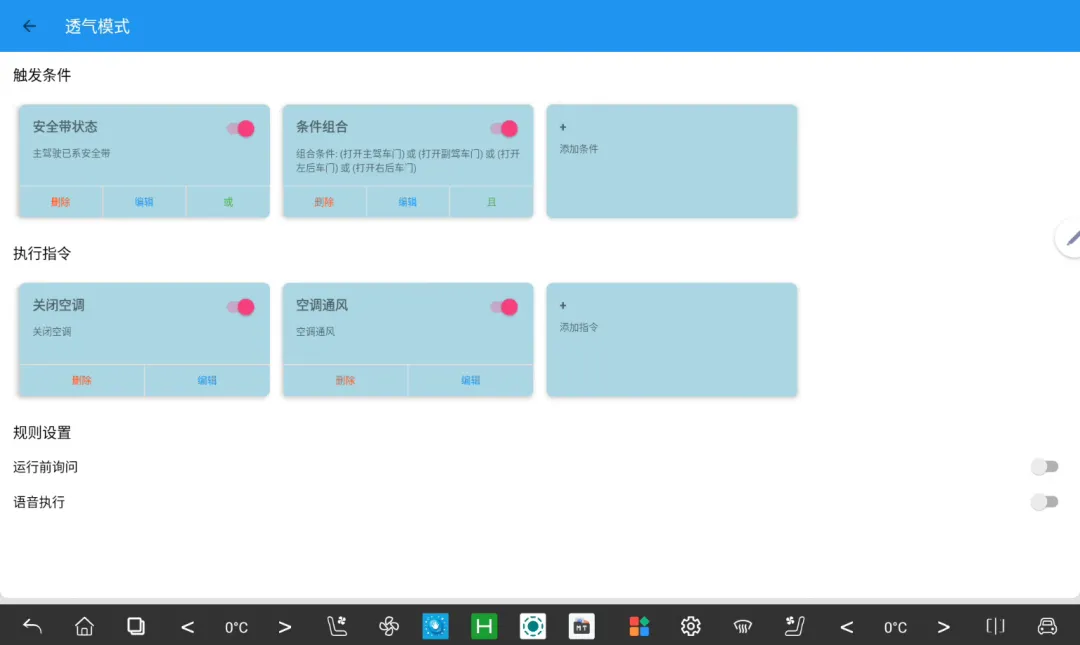 新增条件联动,配置触发条件以及执行指令后,再满足触发条件的情况下,会自动调用车控功能。