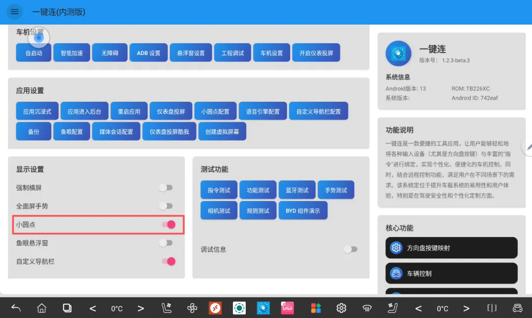 小圆点功能,指一键连提供的悬浮窗,通过悬浮窗上面的按钮可以快捷操作车辆车窗、灯光、座椅等车辆设备的功能。
