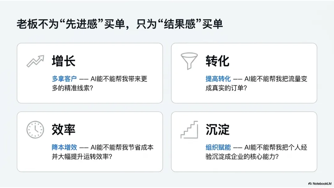 如果你卖的是一个AI工具,客户会问你功能。如果你卖的是一个AI结果,客户会问你怎么落地、怎么验收、怎么复制。