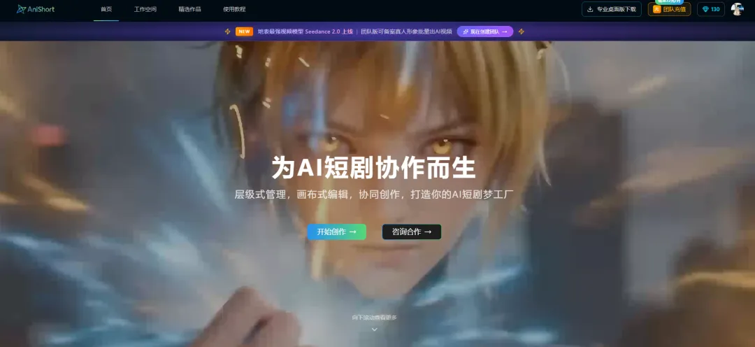 AniShort 是一个专门为 AI 短剧创作设计的全流程可视化协同平台。平台首页收录了大量的精选作品,官方消息透露马上也要为优秀创作者开发收剧通道,平台做一集2分钟,就可以有报名机会。