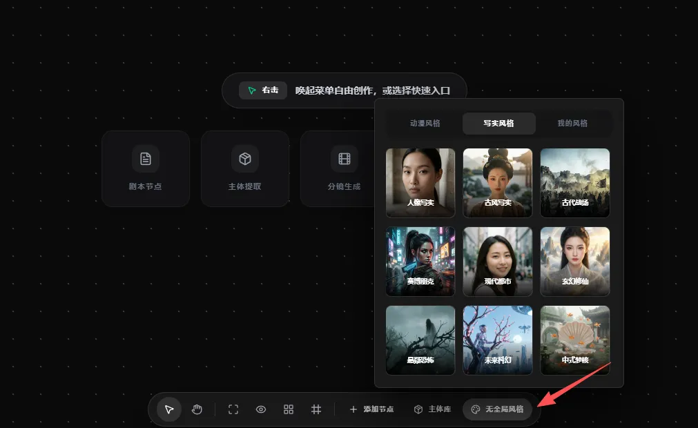 创建完项目,进入画布后,先在底部工具面板完成风格的核心设置:定义全片的视觉基调(写实/动漫等)