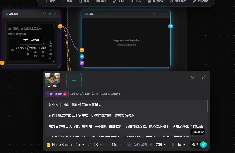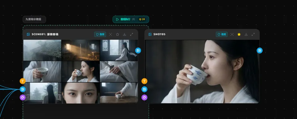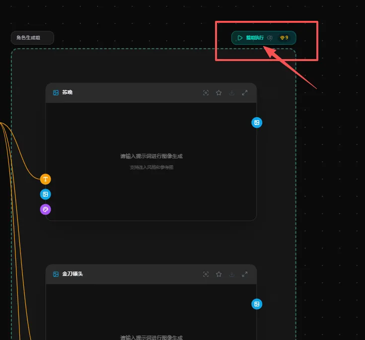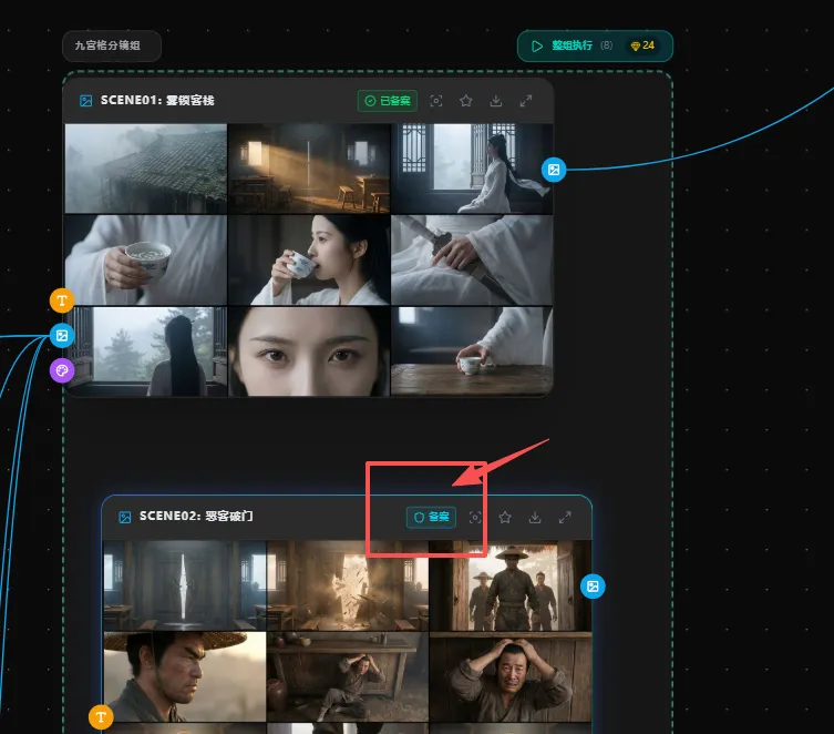这里工具会很贴心的提醒你,要先检查下生图提示词,这点还挺不错的,避免了多余的积分消耗;确认没问题,再点右上角的整组执行