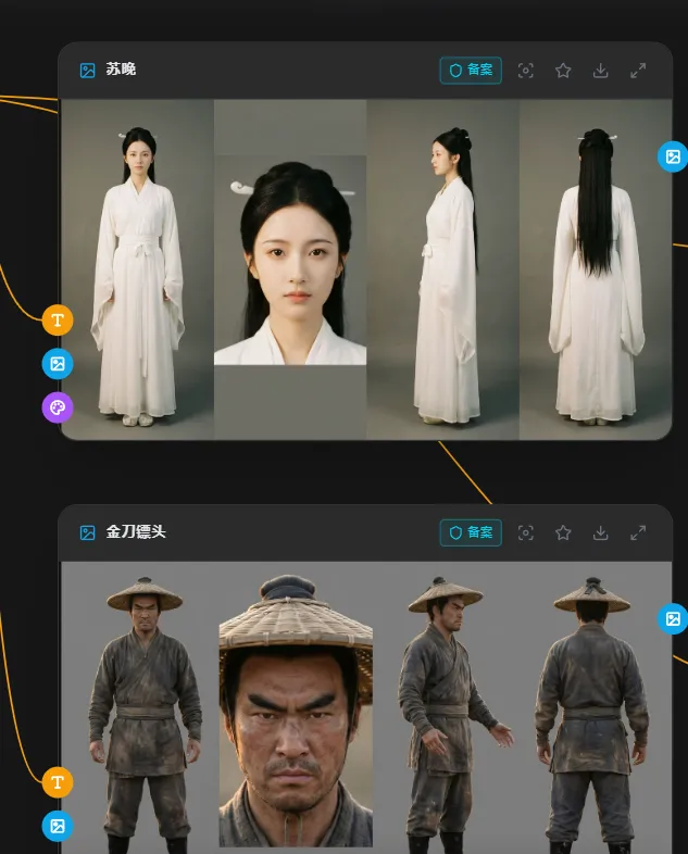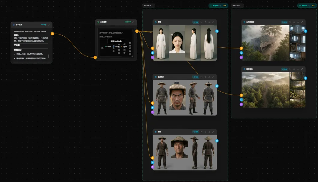 第一轨道(资产生产线): 剧本 → 全局风格 → 角色/场景/道具生成 → 精调定稿 → 入主体库