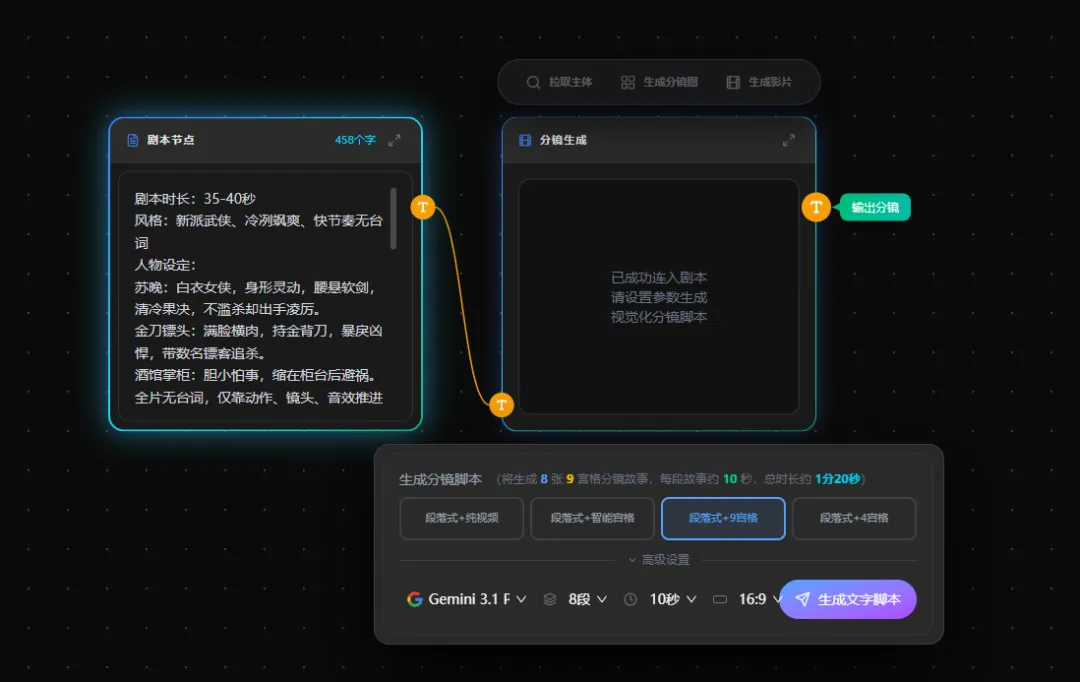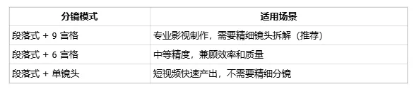 选择影片时长 + 分镜模式(推荐:段落式 + 9 宫格)