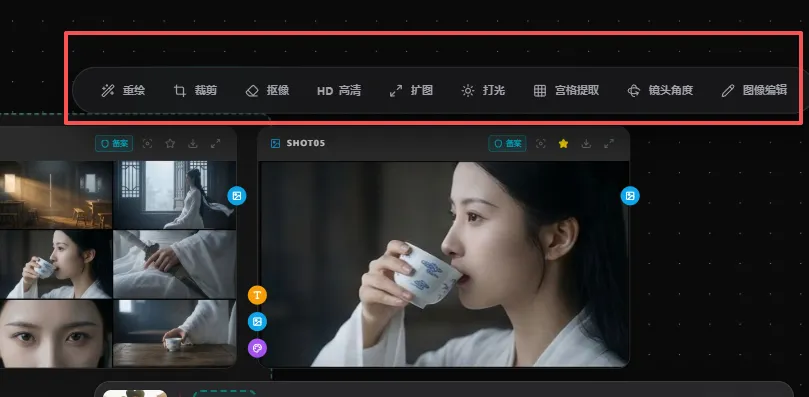 左侧素材库 = 所有星标收藏的分镜自动同步到这里