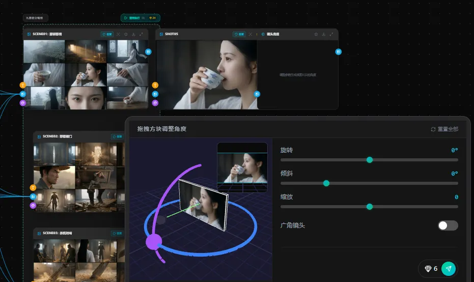 需要调整拍摄视角时,点「镜头角度」→ 拖动旋转/倾斜/缩放/广角滑竿