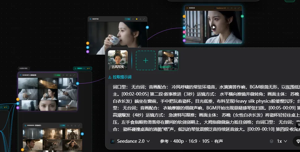 分镜图生成视频,新增一个视频节点,选择刚刚生成的分镜图作为参考图,复制填入AI视频提示词(此处也支持单张图生成)