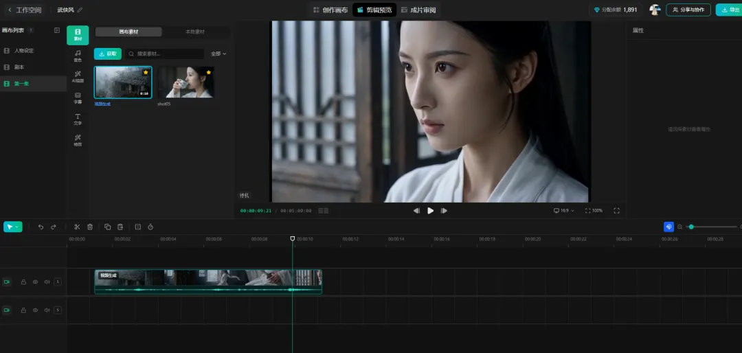 完成分镜收藏后,点顶部导航切换到「剪辑面板」。(此步骤也可以下载素材,导入其他剪辑软件进行后期)