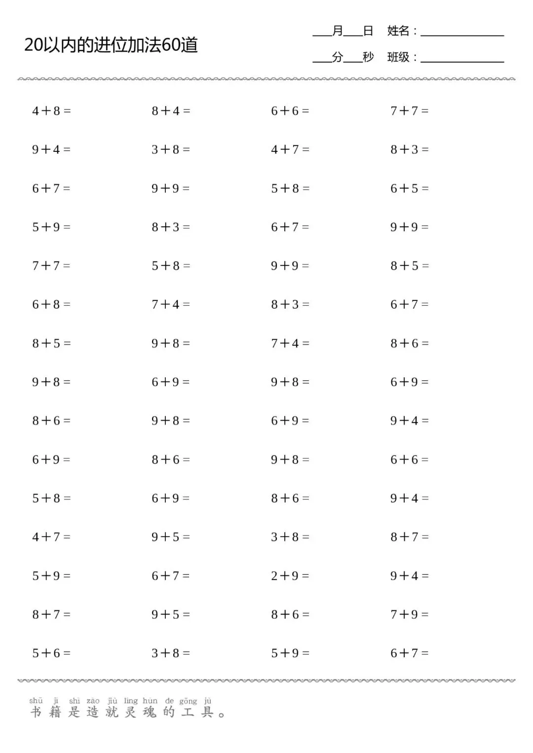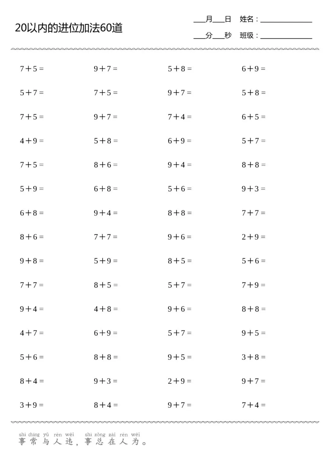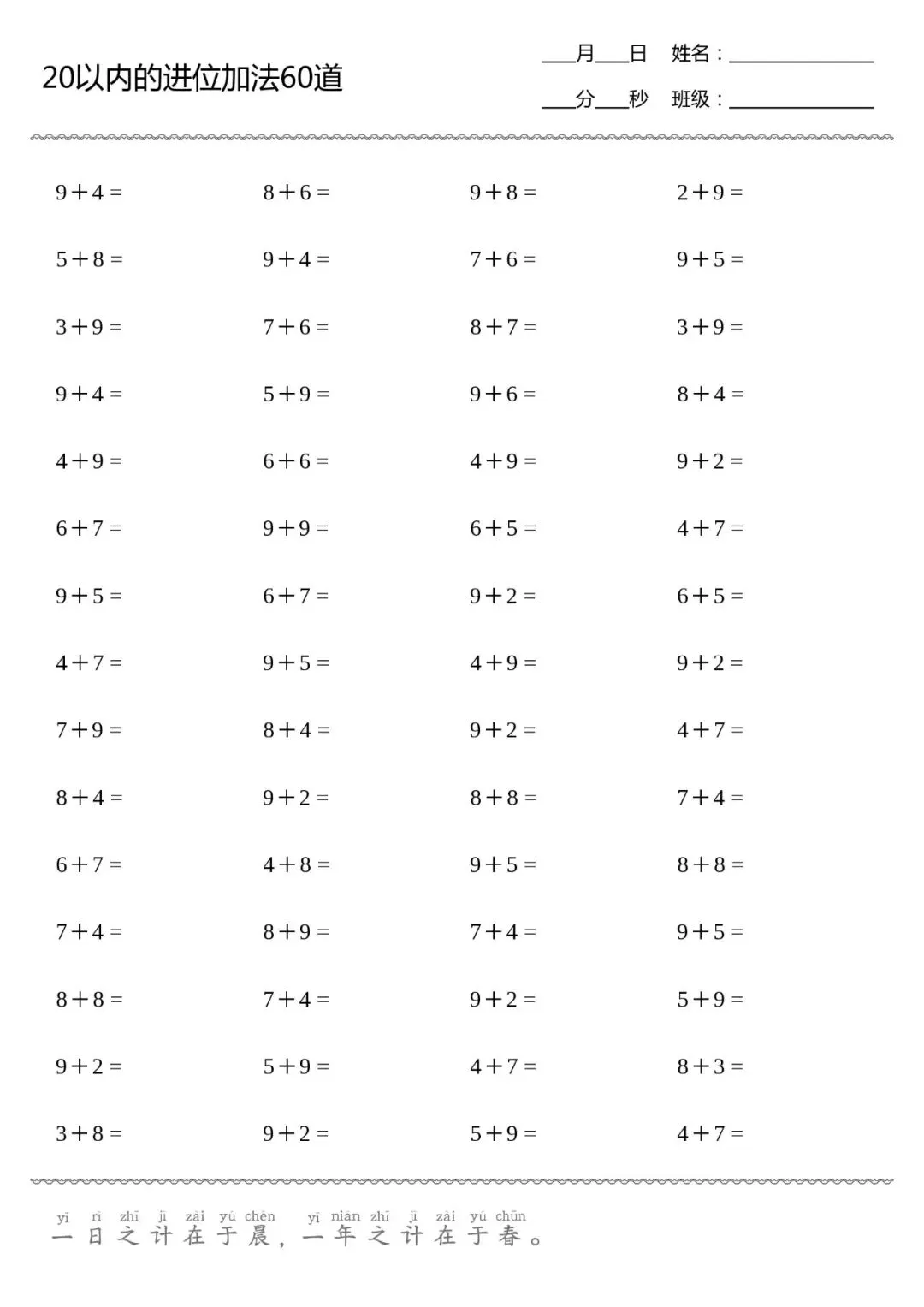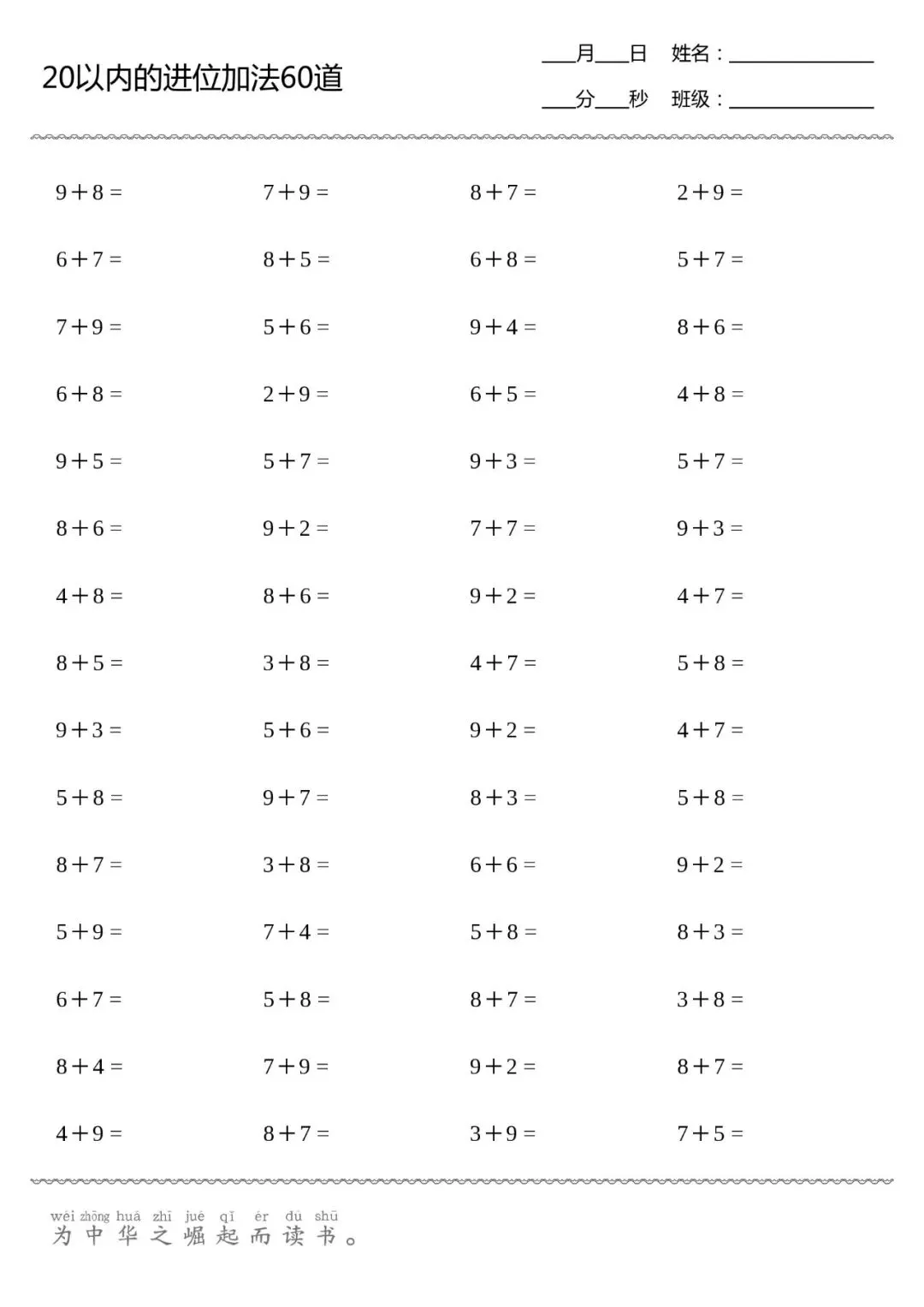 口算打卡 | 20以内进位加法(供8张,可直接打印)