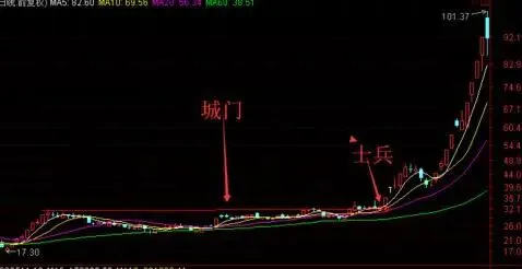 3、士兵:到达前期高点也就是城门附近的K线,就是士兵,士兵攻打到城门的时候,回撤洗盘的幅度越小越好,最好不要回撤,直接在前高附近,强势横盘洗盘。