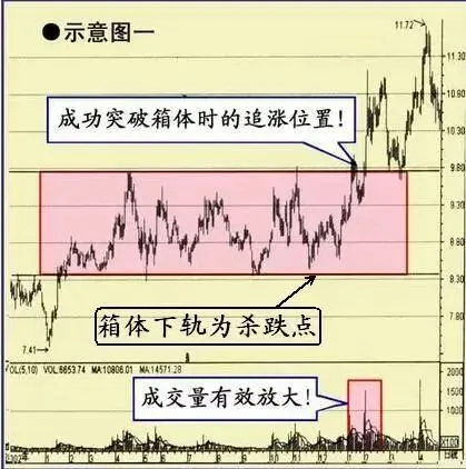 一段时间里股价在箱体里反复振荡运行,在成交量放大的配合下,股价终于突破箱体顶部、开始向上盘升,形成了比较好的买入位置(参见下图一)。