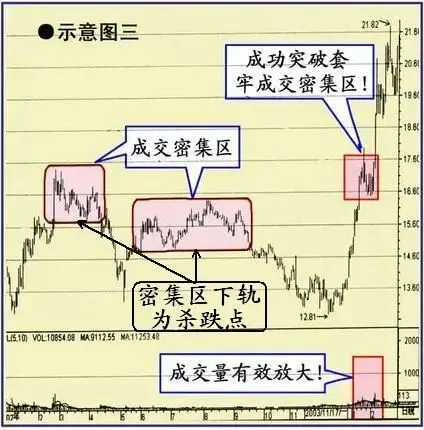 下面这个股票曾经在15—16元之间形成了两次成交密集区,有大量筹码在这一带被套牢。当股价强劲突破了该区域且创出了新高时,显示了主力有志在高位的打算和意图,因而前期高位就有可能成为新一轮行情的起点,所以投资者可以追涨操作(参见下图三)。