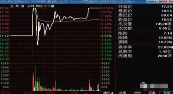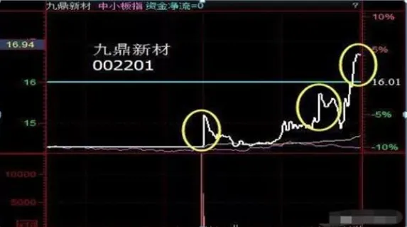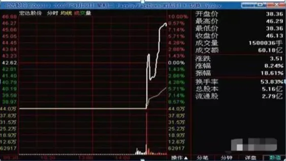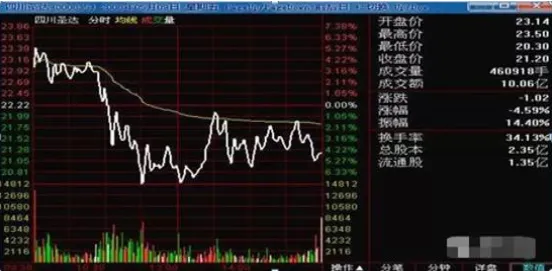 3、盘中震荡激烈震幅很大,分时图上常见幅度巨大的跳水形态,急拉暴跌是主要特征。