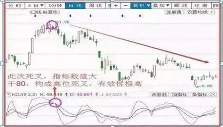 如上图所示,股价冲高震荡后,KDJ指标在数值80上方发出死叉,构成KDJ高位死叉,此时死叉的有效性极高,投资者应果断逢高离场。