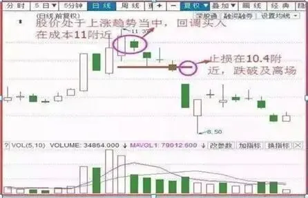 如上图,股价处于放量上涨的趋势当中,追高买入在11块附近,此时要带好止损比如10.4,如果后期跌破止损位,就说明自己趋势判断失误,果断止损纠正错误以免更大的损失。