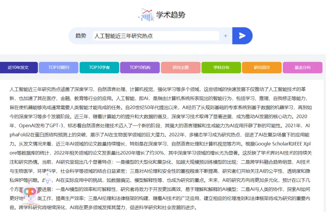 ➡ CNKI AI解法:输入“XX专业(比如:人工智能近三年研究热点)”,关注行业发展,洞察学术趋势,智能数据分析和挖掘生成领域概貌,提供精准、有价值的趋势分析,开口就是“专业味儿”~