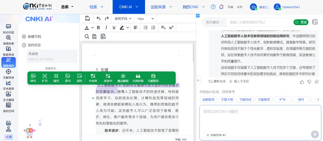➡ CNKI AI解法:辅助撰写,AI实现改写、润色、翻译等初稿的深度优化,自动生成参考文献规范清单。告别标红修改哭唧唧~
