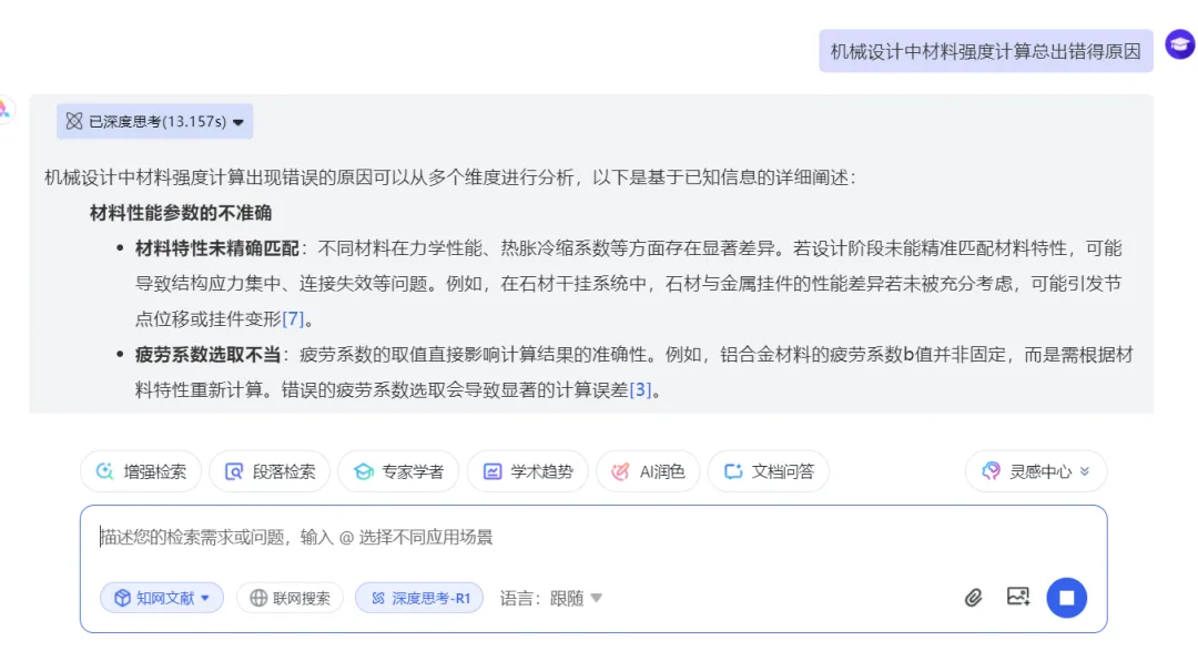 ➡ CNKI AI解法:输入技术难题(例如“机械设计中材料强度计算总出错”),AI秒分析偏差原因,推荐解决方案+关联论文,连导师都点赞!
