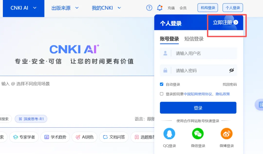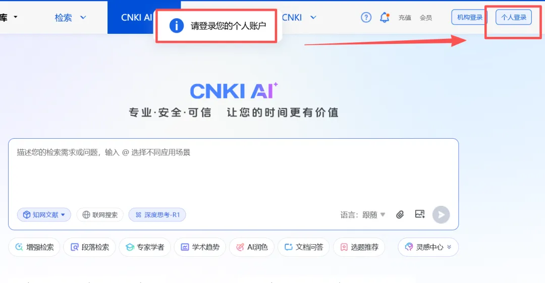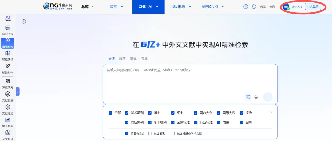 在学校IP范围内,登录CNKI AI网址:ai.cnki.net;