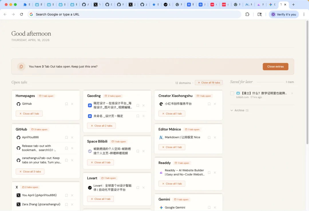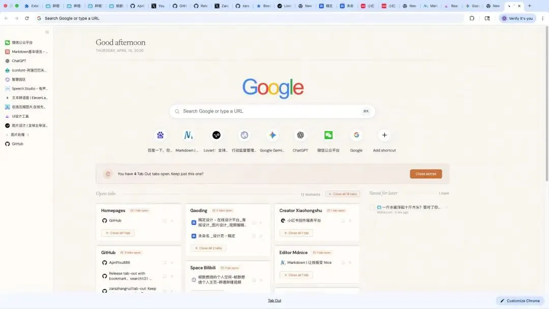 昨天刷到博主张Zara自己做了一个Chrome插件,专门用来管理浏览器里堆积如山的tab页。