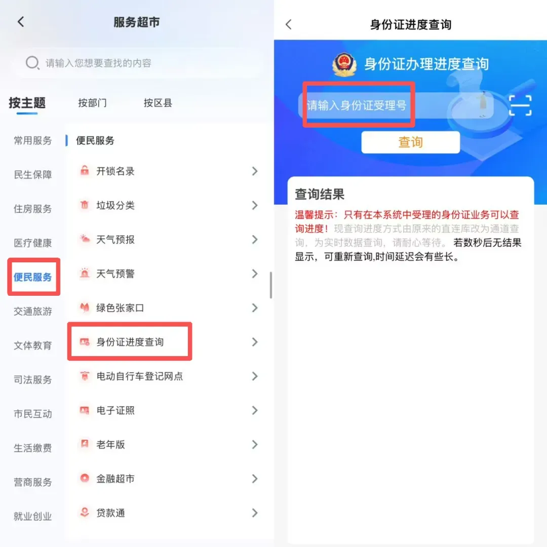 只需在“幸福张家口”App服务超市内选择【便民服务】栏目,点击“身份证进度查询”服务,输入您的身份证受理号,点击“查询”按钮即刻获取办理进度信息: