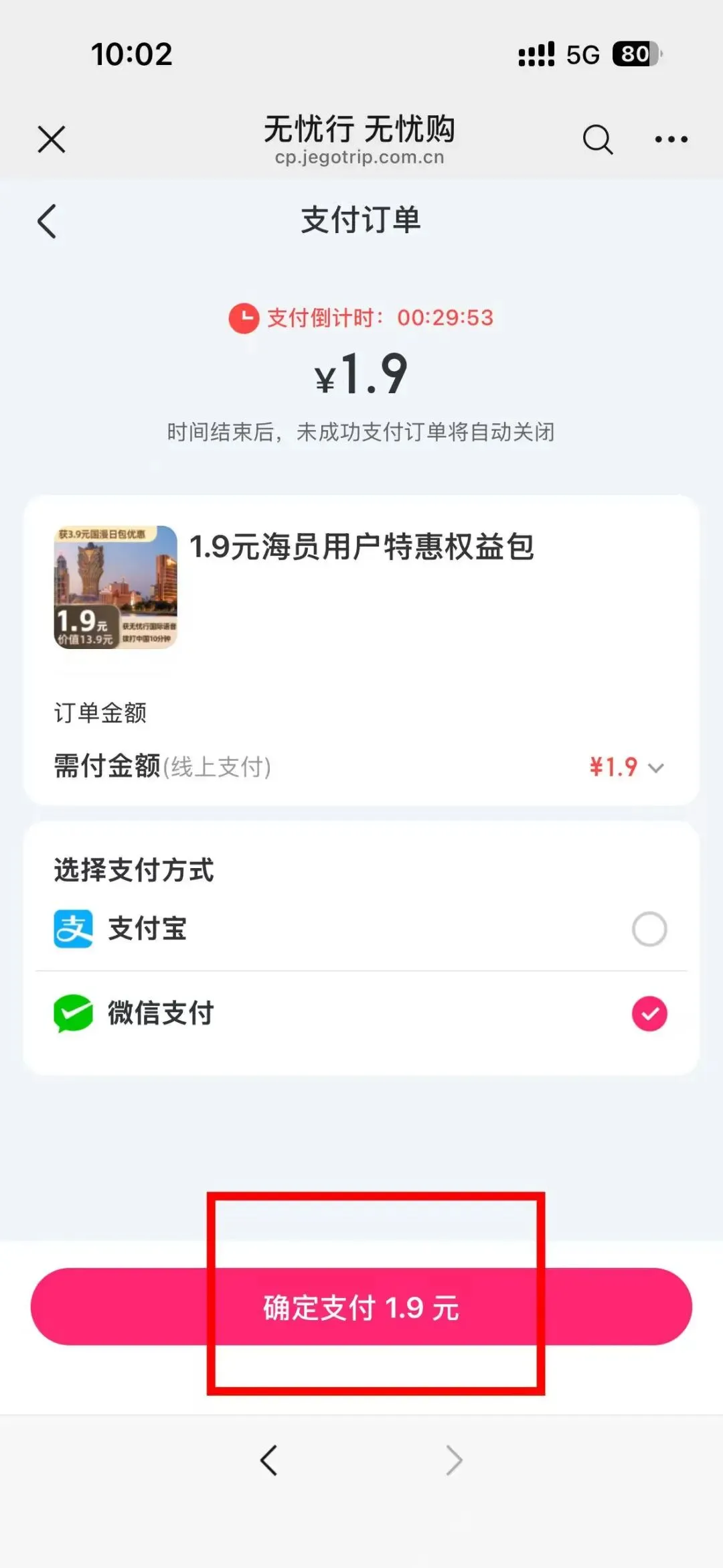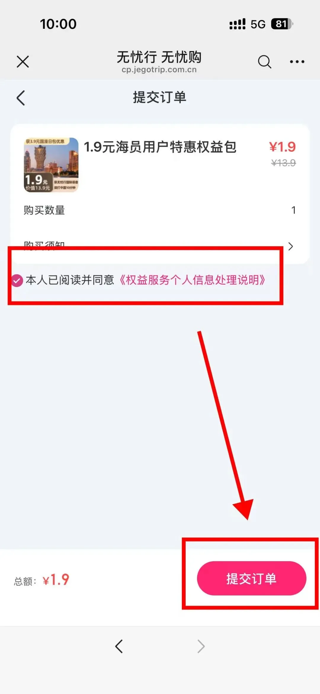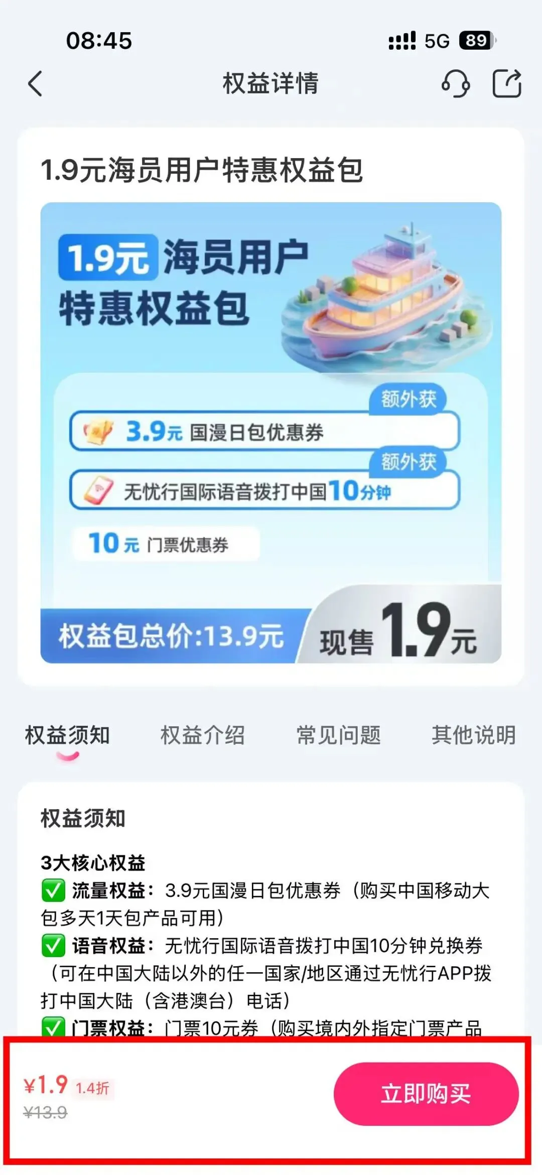 第一步:先买1.9元权益券(送3.9元日包优惠券)