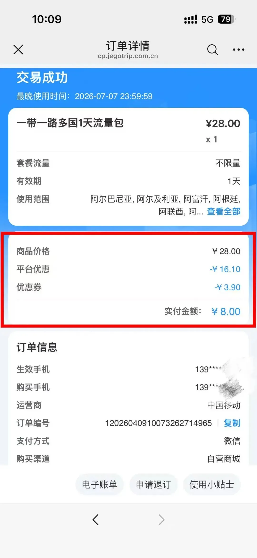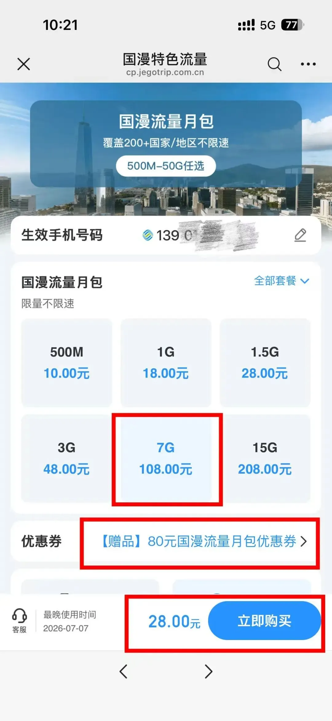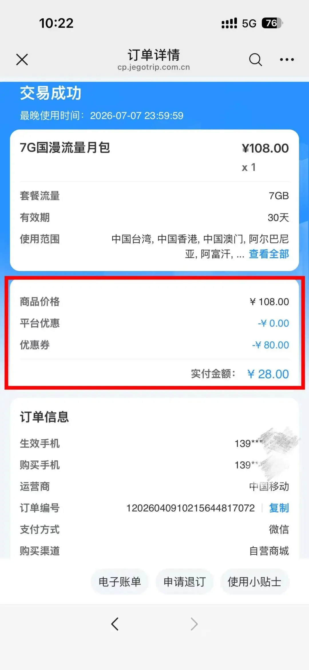 第二步:在买价值108元的月包流量,下单时使用优惠券减80元,合28元下单成功