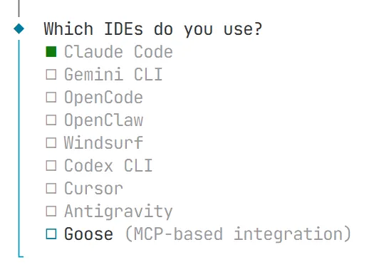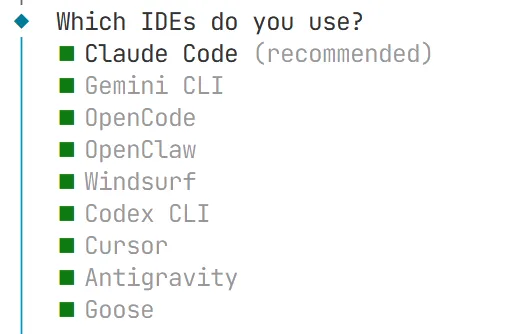 这时弹出选择要安装的IDE,我这里选择推荐安装的claude code,其他IDE按空格键不选择安装。