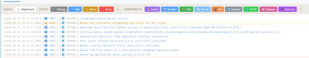 访问 http://localhost:37777,实时查看内存流和摘要时间线。