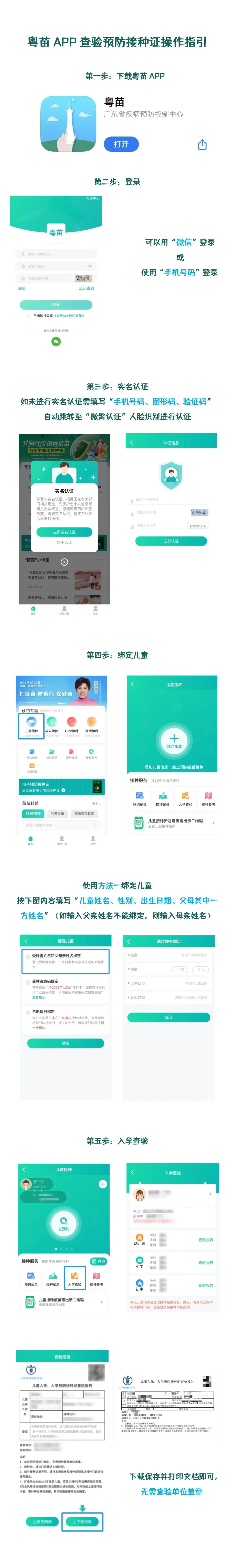 既往在外省、港澳台或国外接种疫苗,且未曾在广东省内登记疫苗接种信息的学生,无法正常使用粤苗APP下载查验报告,家长可携带《儿童预防接种证》到就近的预防接种门诊录入既往接种信息,录入时需提供儿童、父母三方身份证号码,以及父母双方电话号码,完成录入后可通过粤苗APP下载并打印《儿童入托、入学预防接种证查验报告》,交给托幼(育)机构/学校。