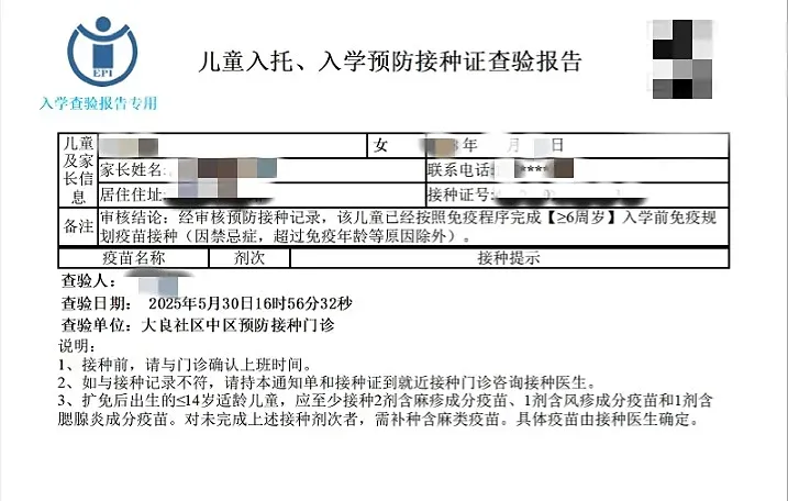 《儿童入托、入学预防接种证查验报告》