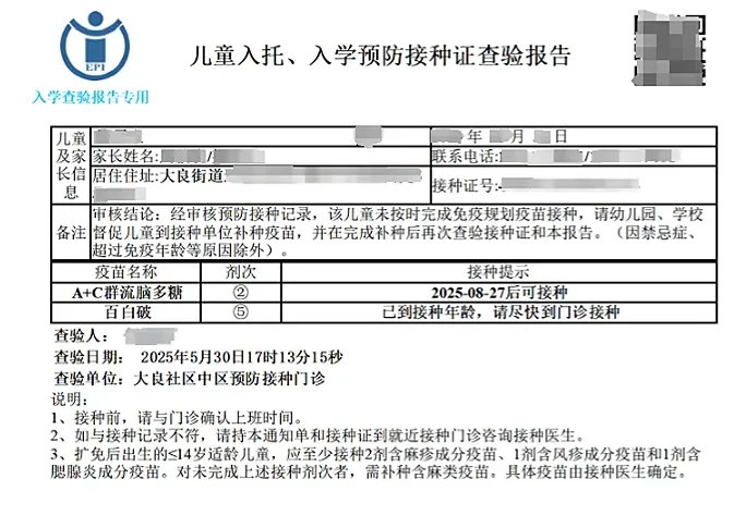 查验报告上会明确标注“已到接种年龄,请尽快到门诊接种”或“具体日期后可接种”,家长需根据提示,尽快带孩子到预防接种门诊补种疫苗。