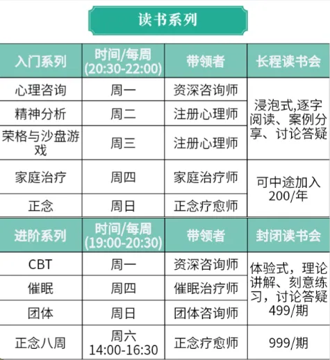 目前推出CBT进阶,团体进阶、催眠进阶和正念八周读书会。