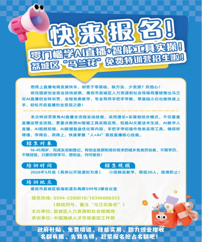 依托国家创业就业扶持政策,莆田市荔城区人力资源和社会保障局重磅推出马兰花AI直播创业特训营,全程免费教学,专业导师手把手带教,零基础小白也能快速上手,轻松开启直播创业变现之路!