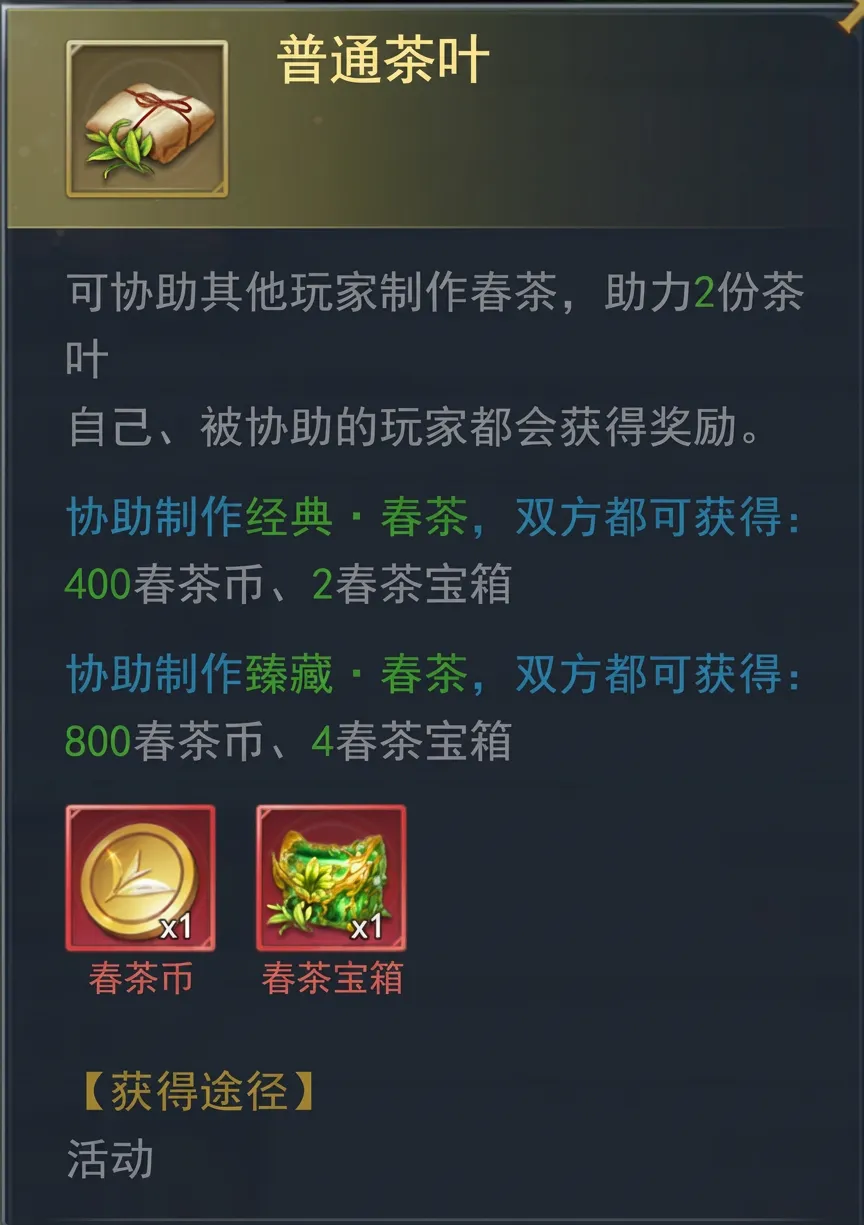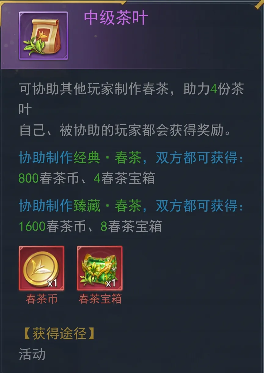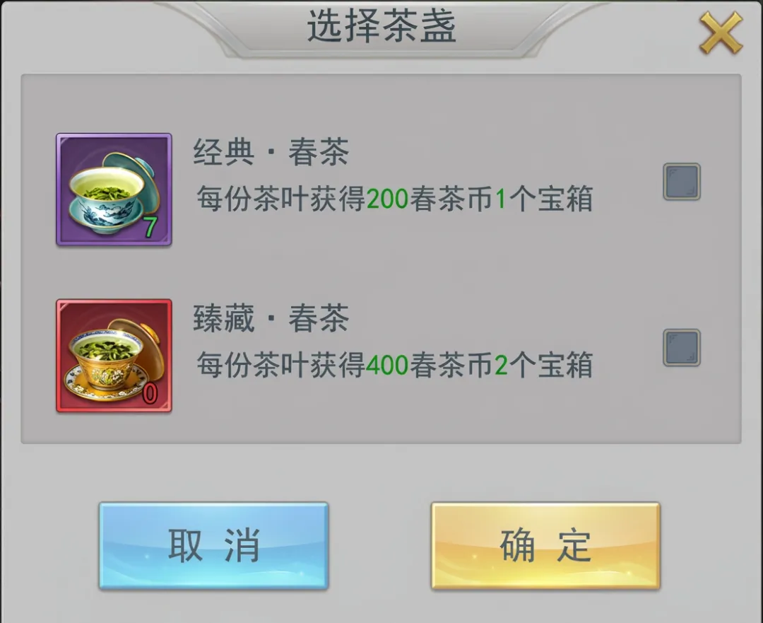 使用银茶盏或金茶盏分别制作经典·春茶、臻藏·春茶,获得春茶币、春茶宝箱奖励