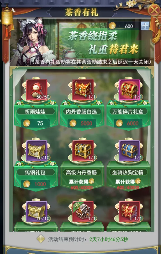 活动期间开放茶香有礼商店,消耗春茶币可兑换各类珍稀奖励