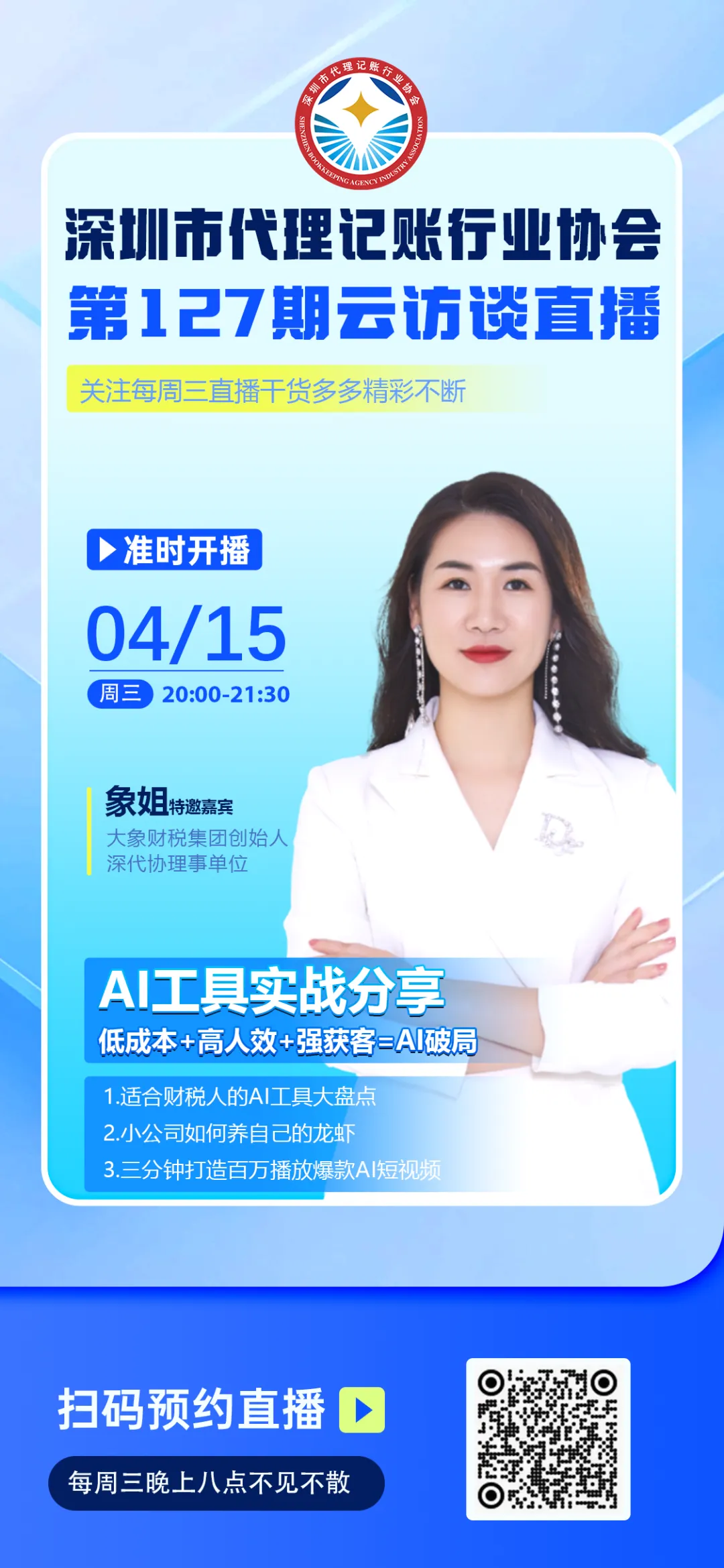 2026年4月15日晚上8点,深圳市代理记账行业协会首创“云访谈”系列公益直播第127期准时开播,本期特邀嘉宾为协会理事单位大象财税集团创始人 象姐,分享《AI工具实战分享》。本期直播累计观看人数超2200,感谢同行朋友一如既往地收看支持。