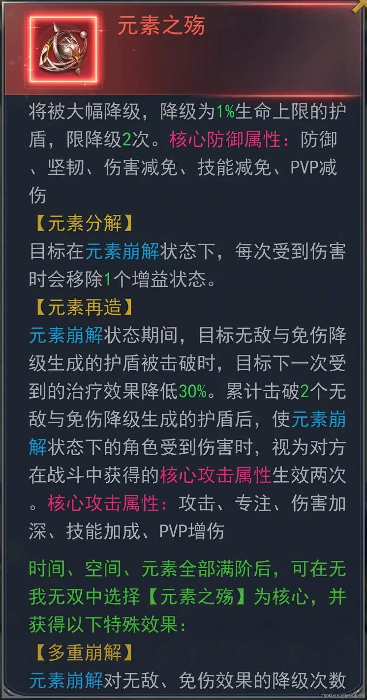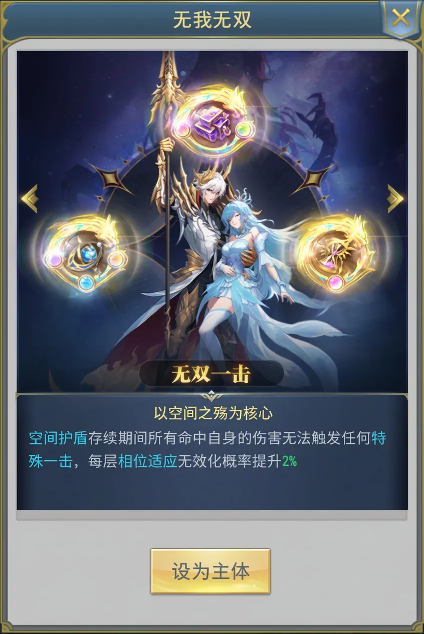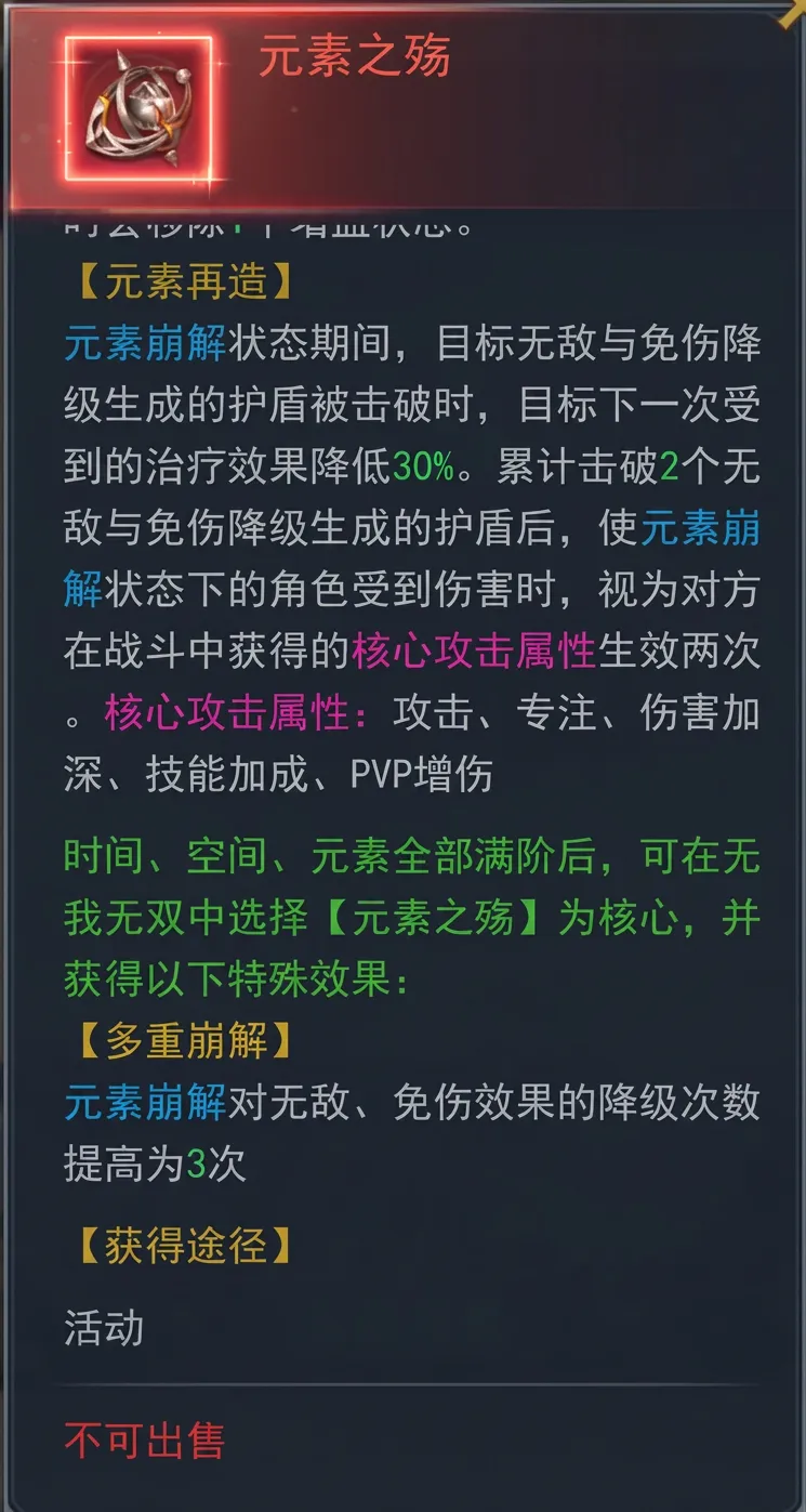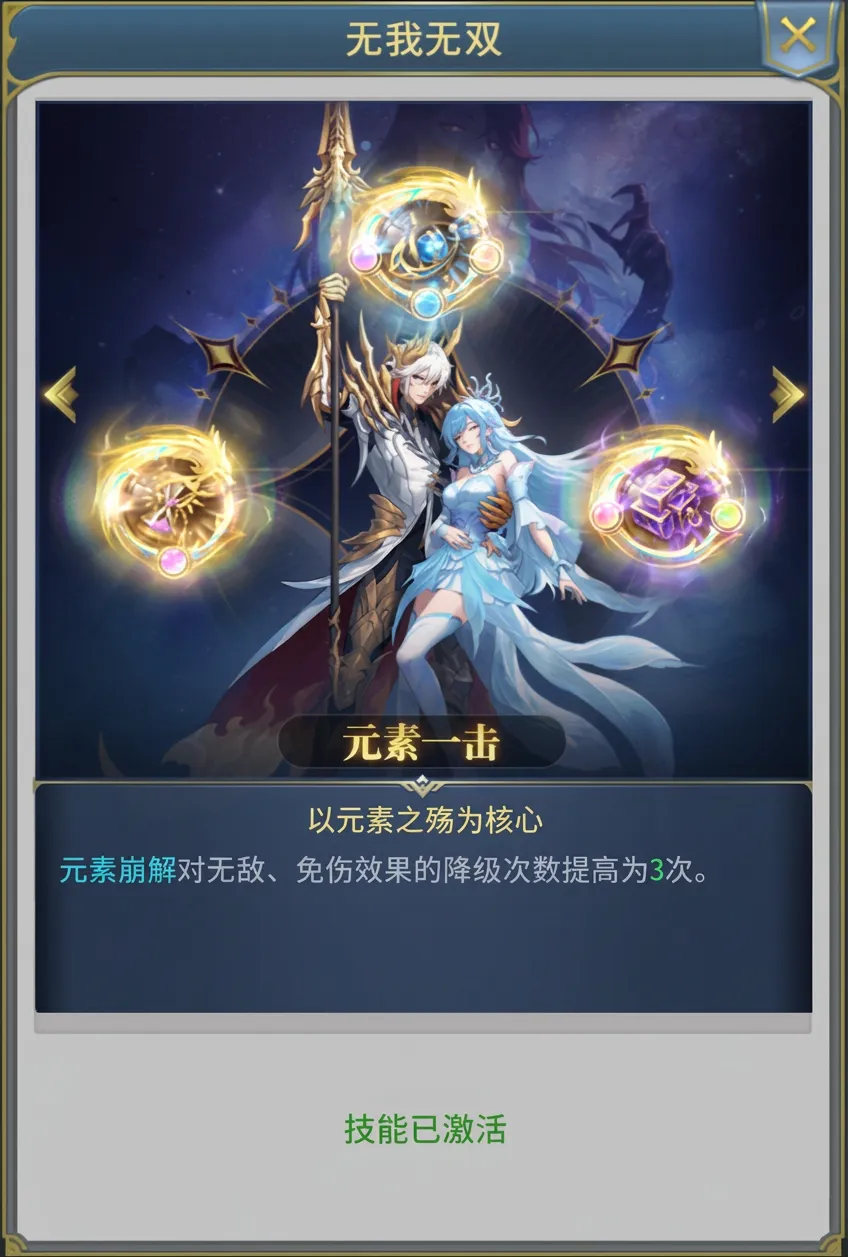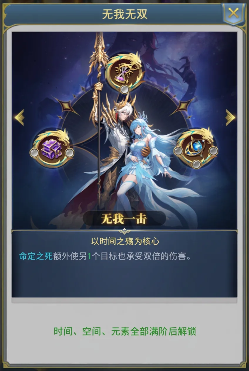 特殊效果:当时间、空间、元素全部激活满阶时,可在无我无双中选择核心能力,选择后激活对应的特殊效果