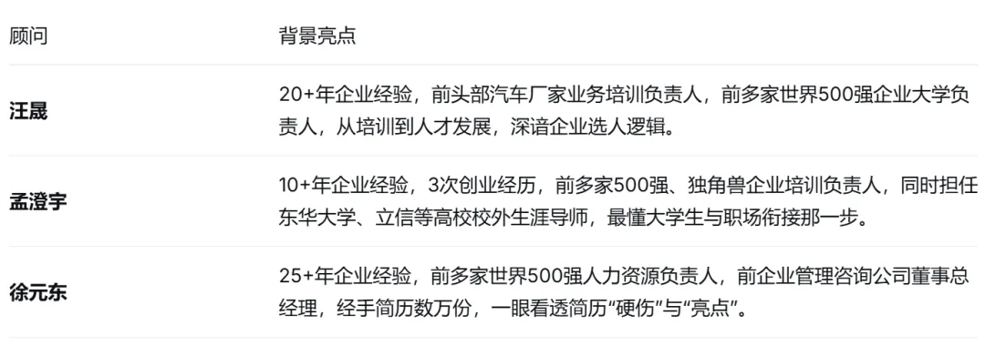 最后的HR高管点评,可能是最“刺激”也最珍贵的部分。三位加起来拥有超过五十年企业经验的资深顾问——汪晟老师、孟澄宇老师、徐元东老师——会直接看你的简历,告诉你哪里没说清楚,哪里其实很动人,哪里再往前推一步,就是敲门砖。