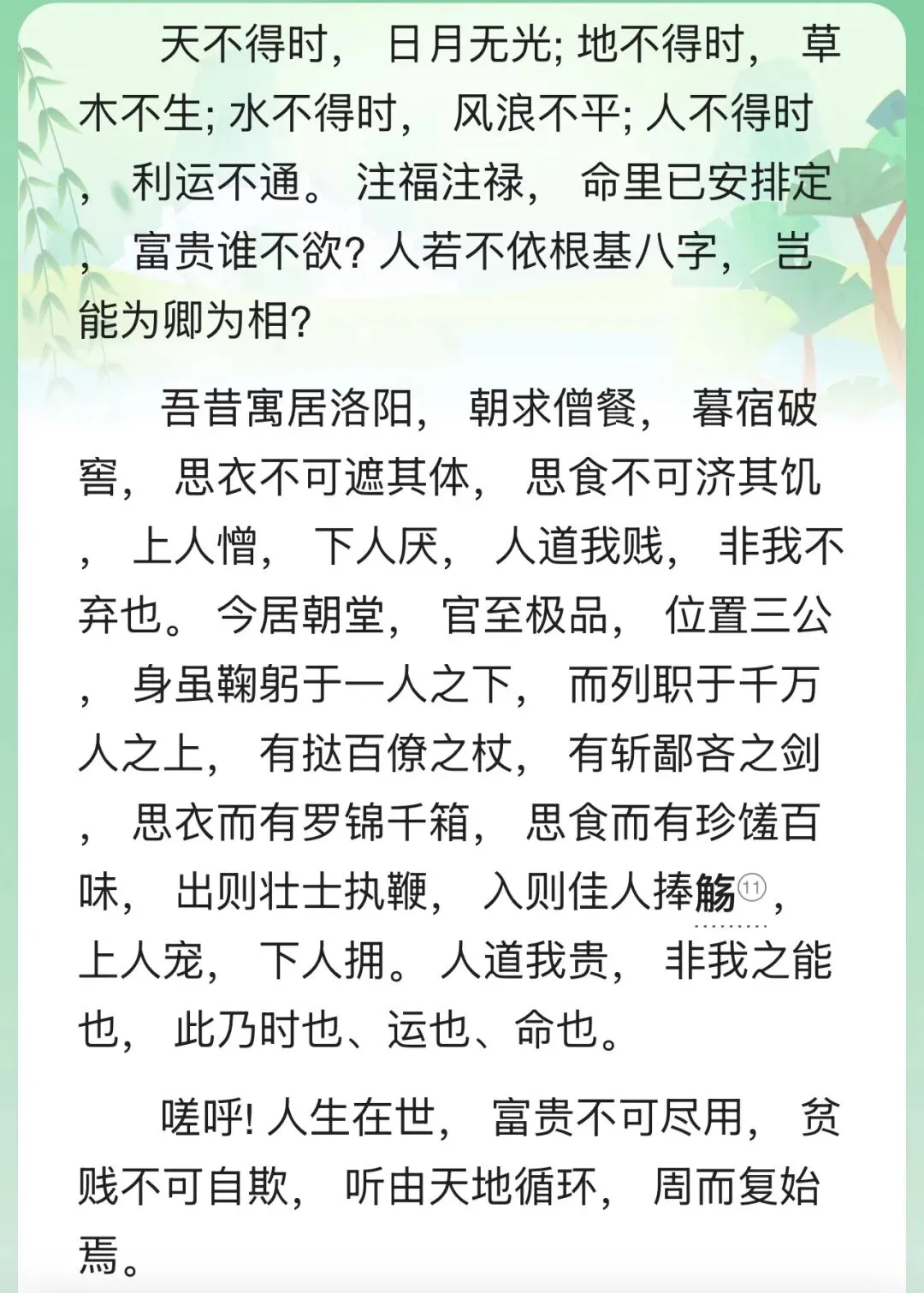 以上出自北宋宰相吕蒙正所作的《破窑赋》,后世也常称之为《寒窑赋》、《命运赋》或《时运赋》。吕蒙正幼时家贫,曾与母亲同住寒窑,以乞讨为生,后发奋读书官至宰相。相传此文是吕蒙正为告诫当时年少气盛的太子(后来的宋真宗)而作,旨在说明人生命运的起落无常及天地时空的变化循环。文章通过列举历史上诸多名人,如姜子牙、孔子、韩信等的命运磨难,阐述“天道无常”和“人情冷暖”是世间常态,规劝人们要接受现实并顺应时势。